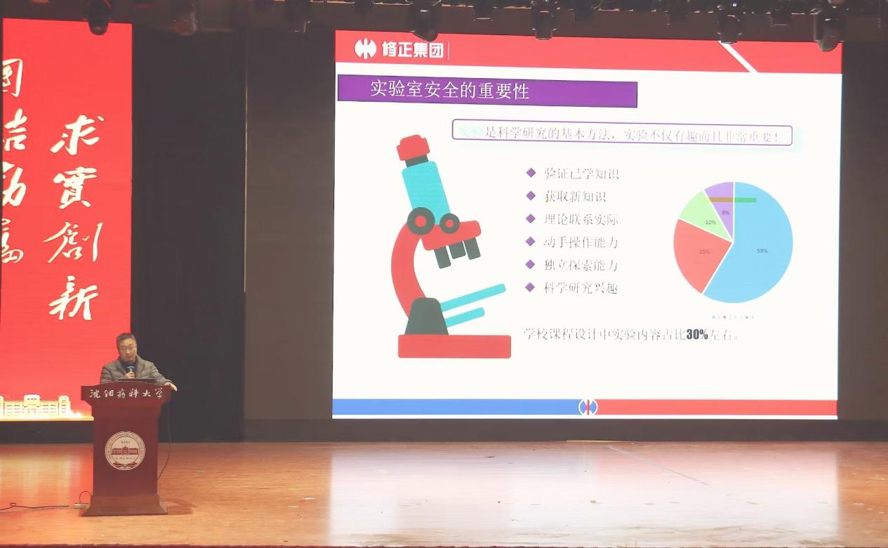 2025年12月5日,药学院在大学生活动中心多功能厅开展实验室安全专项培训活动。修正药业集团新高制药质量副总经理杨启家、生产副总经理刘辉、化验室主任赵立峰、药学院党委书记李哲、副院长熊志立、副院长赵勤富、副院长宋艳志、副院长毛玉玲、党委副书记史琳琳、学院教学秘书、毕业年级辅导员出席活动。