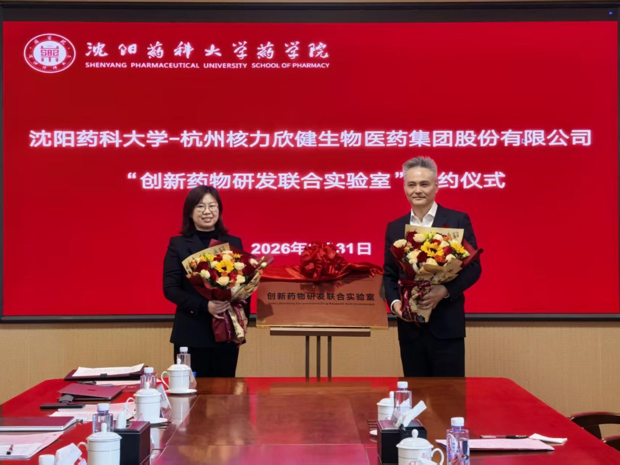 3月31日上午,沈阳药科大学与杭州核力欣健生物医药(集团)股份有限公司共建的“创新药物研发联合实验室”揭牌仪式在药学院隆重举行。杭州核力欣健生物医药(集团)股份有限公司董事长张文杰、研发中心副总经理斯智萍、运营中心总监钱瑛娜、沈阳药科大学科技园主任兼科研处副处长秦铭泽、药学院院长张宇、药学院党委书记李哲、合作实验室负责人宋艳志教授、课题组邓意辉教授、刘欣荣副教授、汤雪莹博士后出席揭牌仪式。